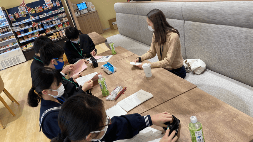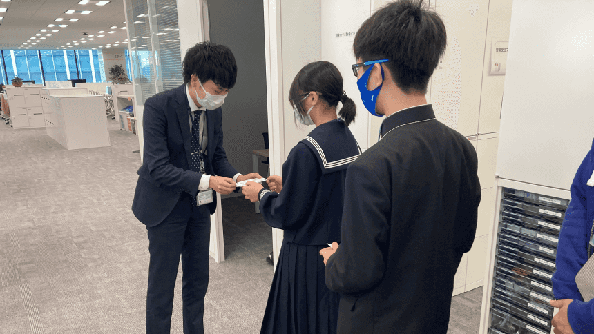 中学生には、氏名が記載されている部分を空白にした名刺を配布し、手書きで名前を書いてもらいました。初めての名刺交換です。