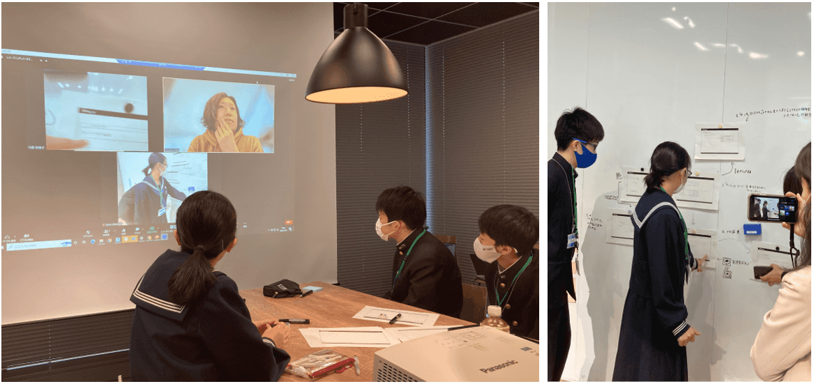 一時間ほど検討したところで、Zoomで当社のUXデザイナーとつないでレビュー会をしました。専門家ならではのアドバイスに社員もふくめて一同ふむふむ。なにげなく置いているボタン配置の「理由」について考え始める中学生たちでした。