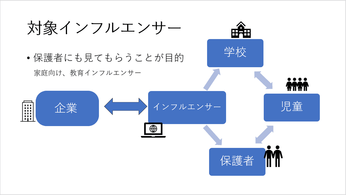 たとえば「SNSのインフルエンサーを使う」というアイデアは、ありがちではあるのですが、他の媒体へ広告を出す場合と費用を比較したり、以下のような構造を示した上で提案してくれました。