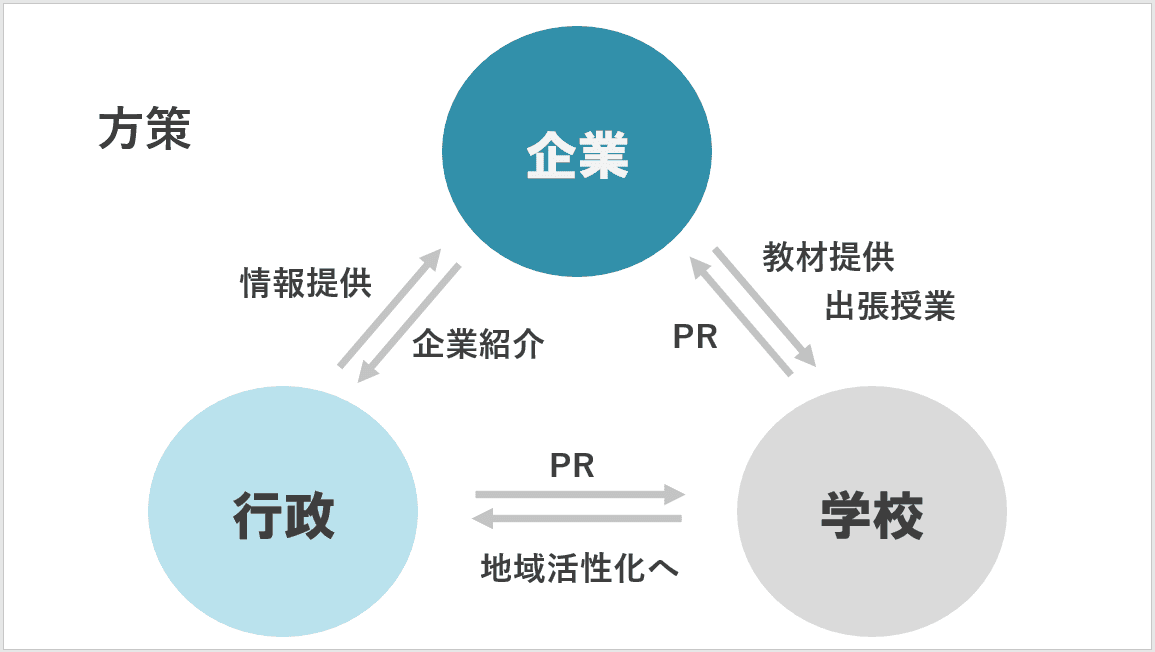 こちらは「地域活性化につながるようなテーマで授業をつくり、行政、企業、学校にそれぞれメリットがあるようなスキームを組むのがよいのではないか」という提案です。