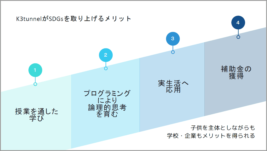 こちらは「SDGsの教材とすることで補助金獲得につながるのではないか」という提案です。具体的な補助金制度について調べたりK3Tunnelのミッションの具体的変更内容の検討もしてくれていました。