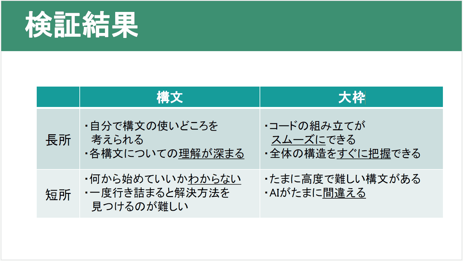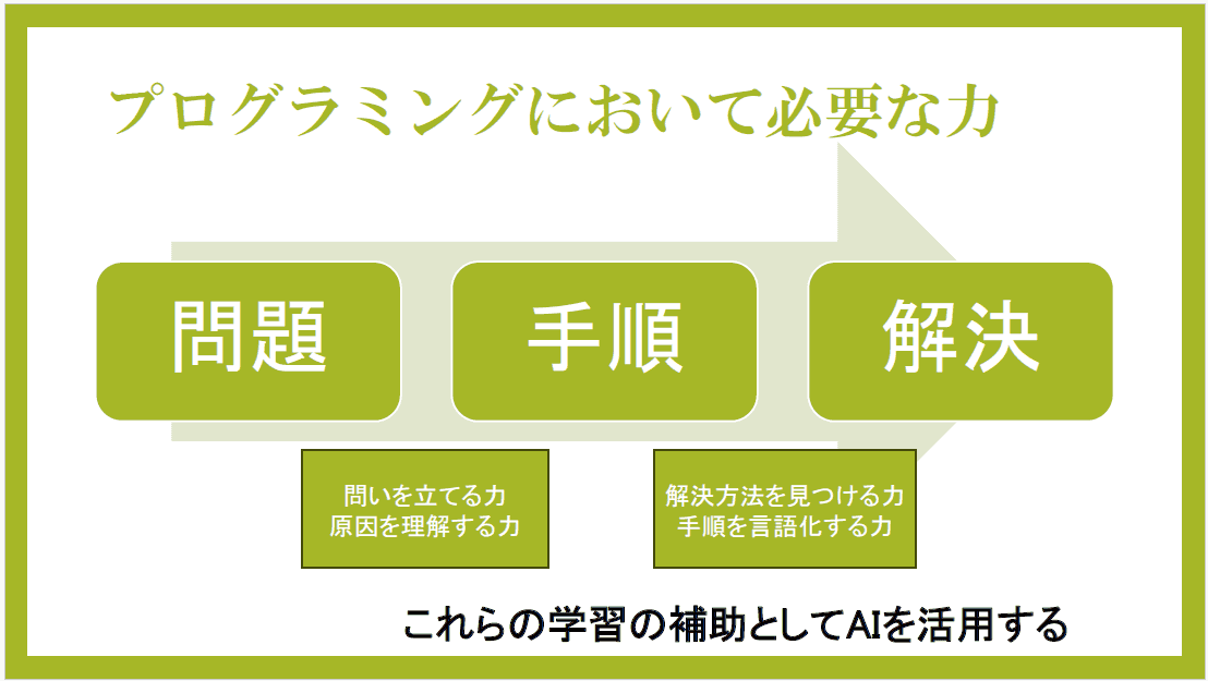 • AIのみだとプログラミング学習に効果的ではなく、自分の知っている知識を発展させるために補助的に使うのがよい