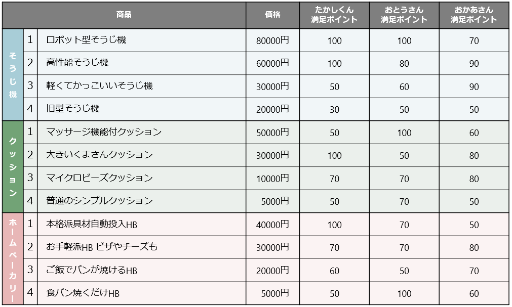 価格と満足ポイントをリストにしましたが、どうすればよいのかよくわかりません。