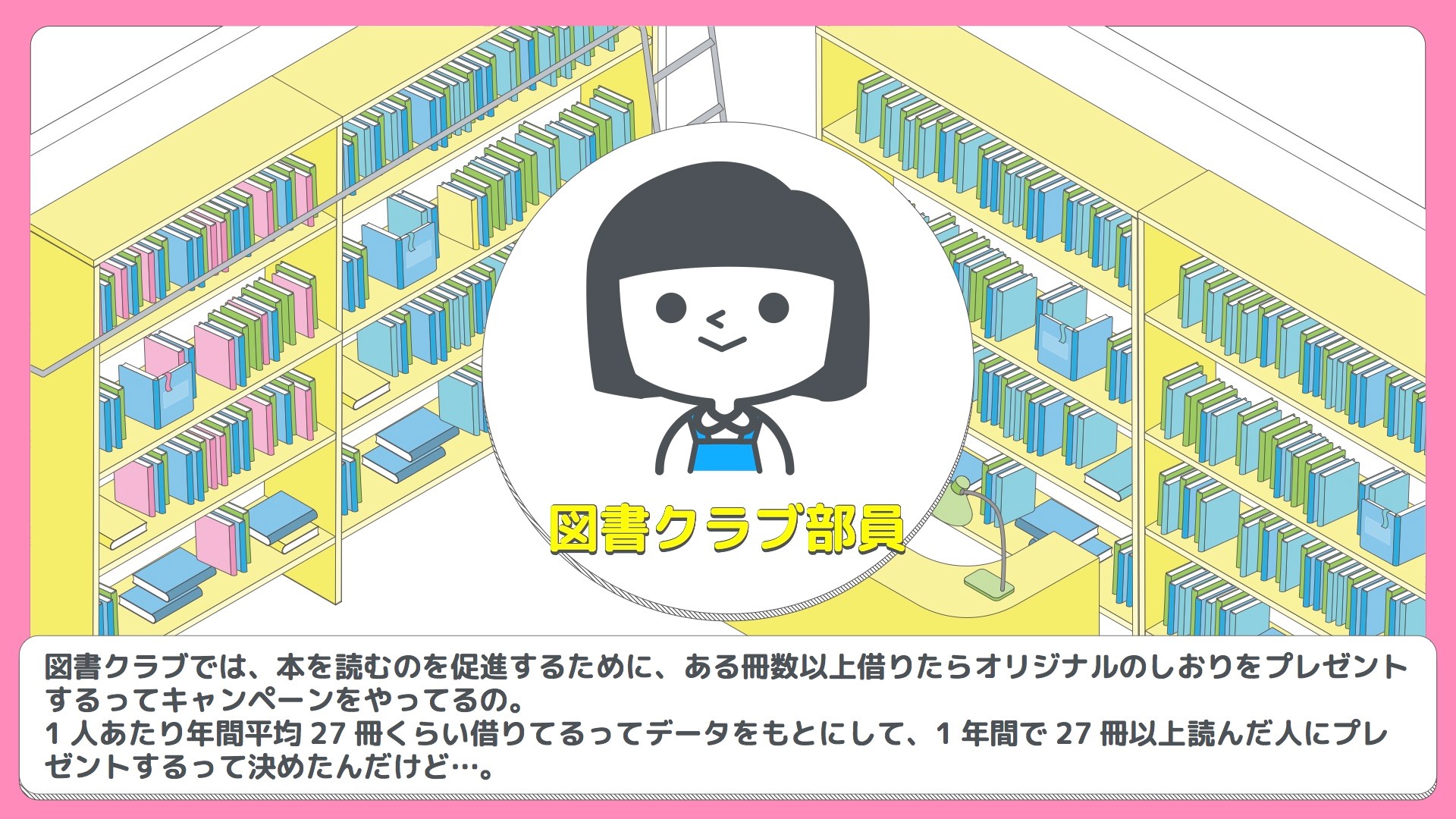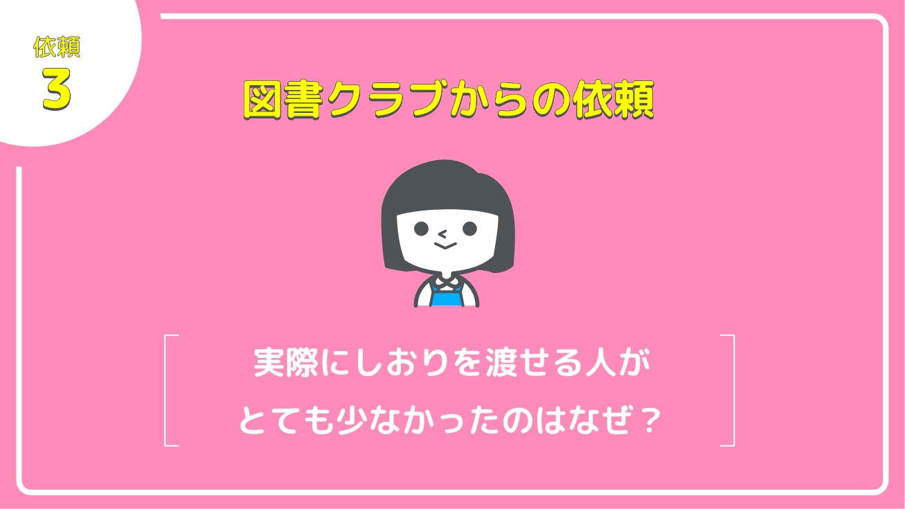 データを分せきして、しおりを渡せる人がとても少なかった理由を考えて、何冊からしおりを渡すようにすればよいのかを求めるプログラムを書いてみよう。